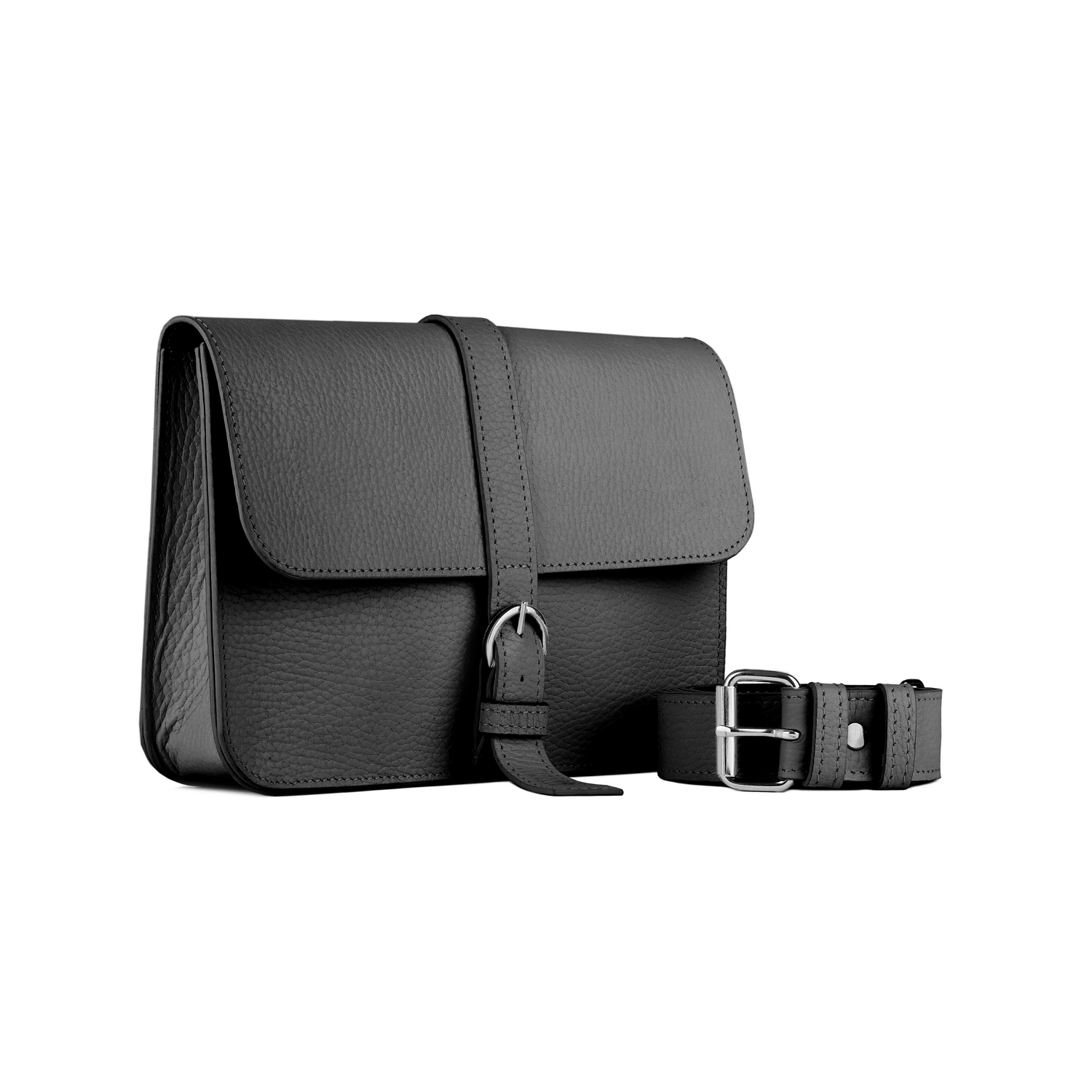 Designul versatil include o curea lungă, reglabilă, ce permite purtarea crossbody sau în jurul taliei.