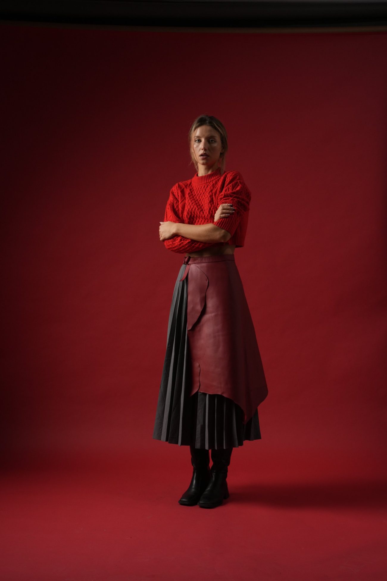 Catrință asimetrică realizată din piele naturală roșie.