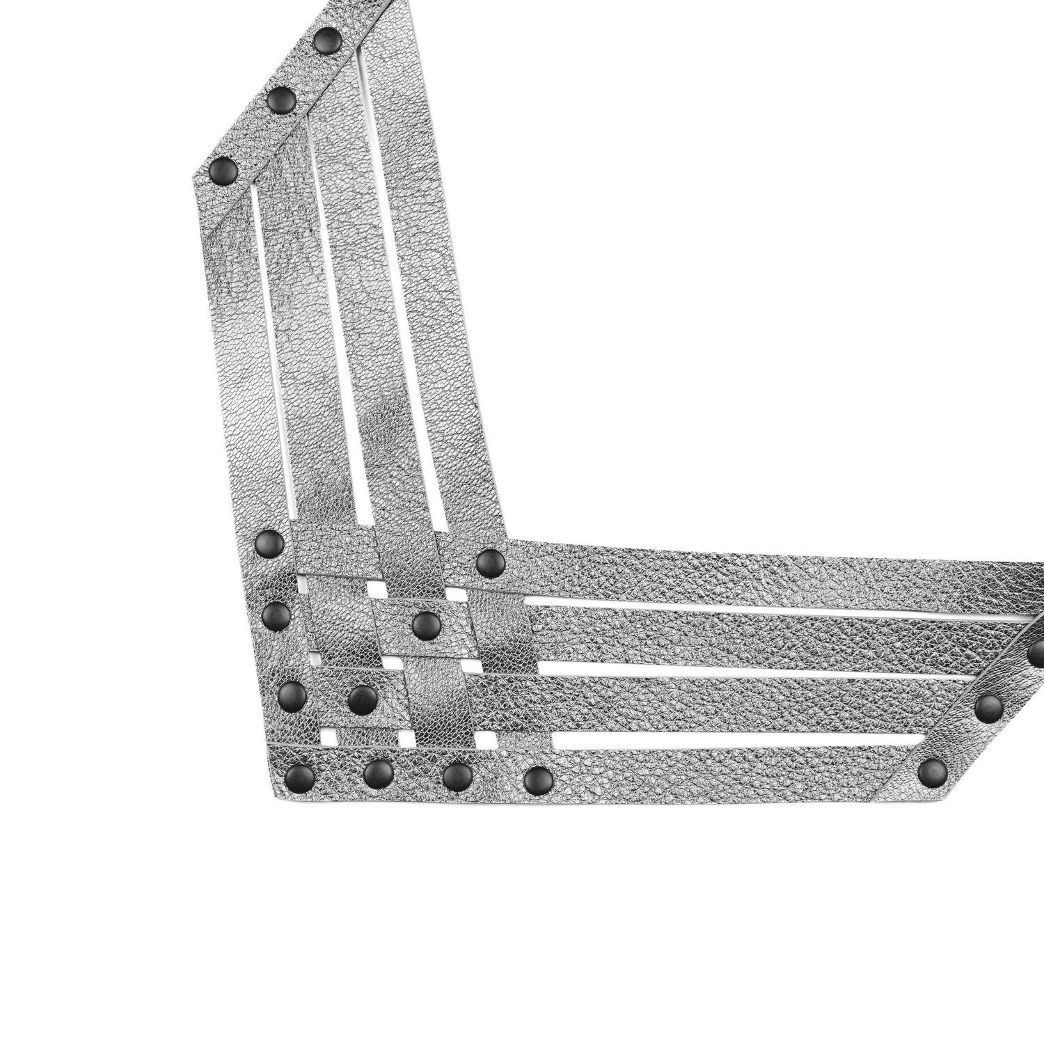 Acest model este realizat manual din benzi înguste de piele, asamblate cu nituri negre dispuse simetric.