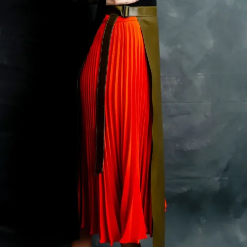 Croiala este dreaptă, cu sistem lateral reglator integrat în talie și detalii asimetrice.