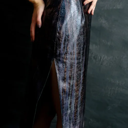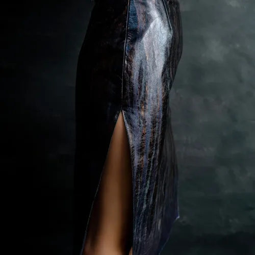 Fustă midi din piele naturală bleumarin, texturată manual.
