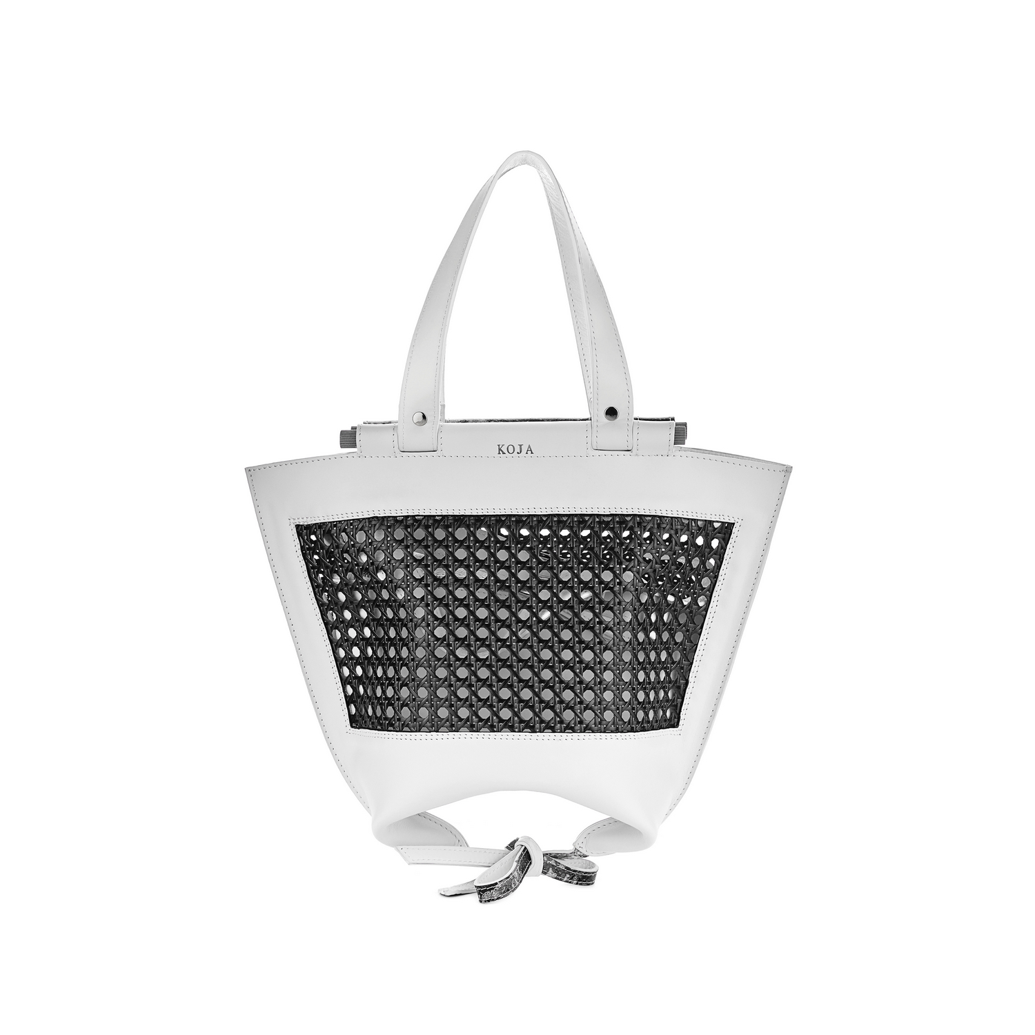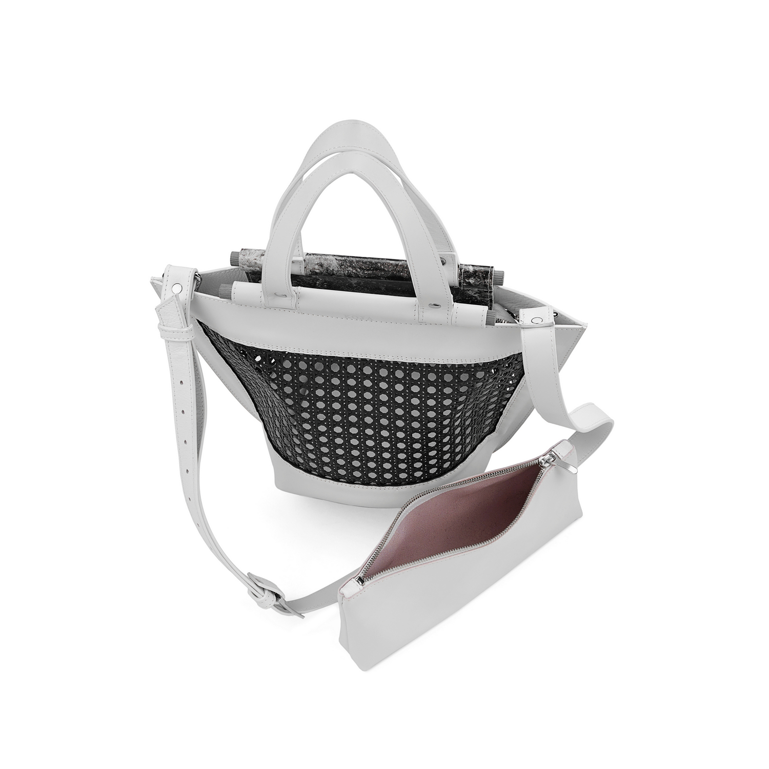 Geanta poate fi purtată pe umăr sau în mână, datorită mânerelor scurte fixate pe bare de lemn și bretelei lungi, reglabilă și detașabilă.