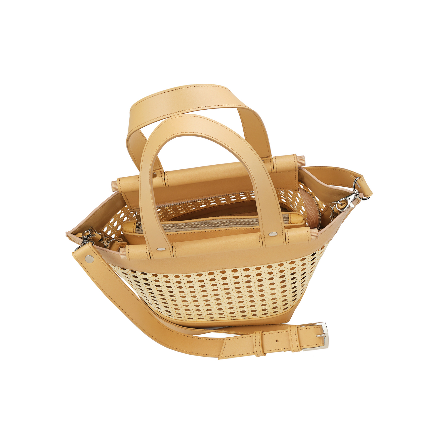 Geanta poate fi purtată pe umăr sau în mână, datorită mânerelor scurte fixate pe bare de lemn și bretelei lungi, reglabilă și detașabilă.