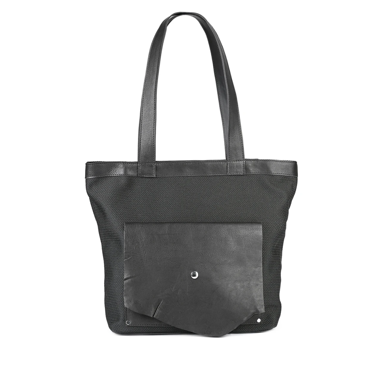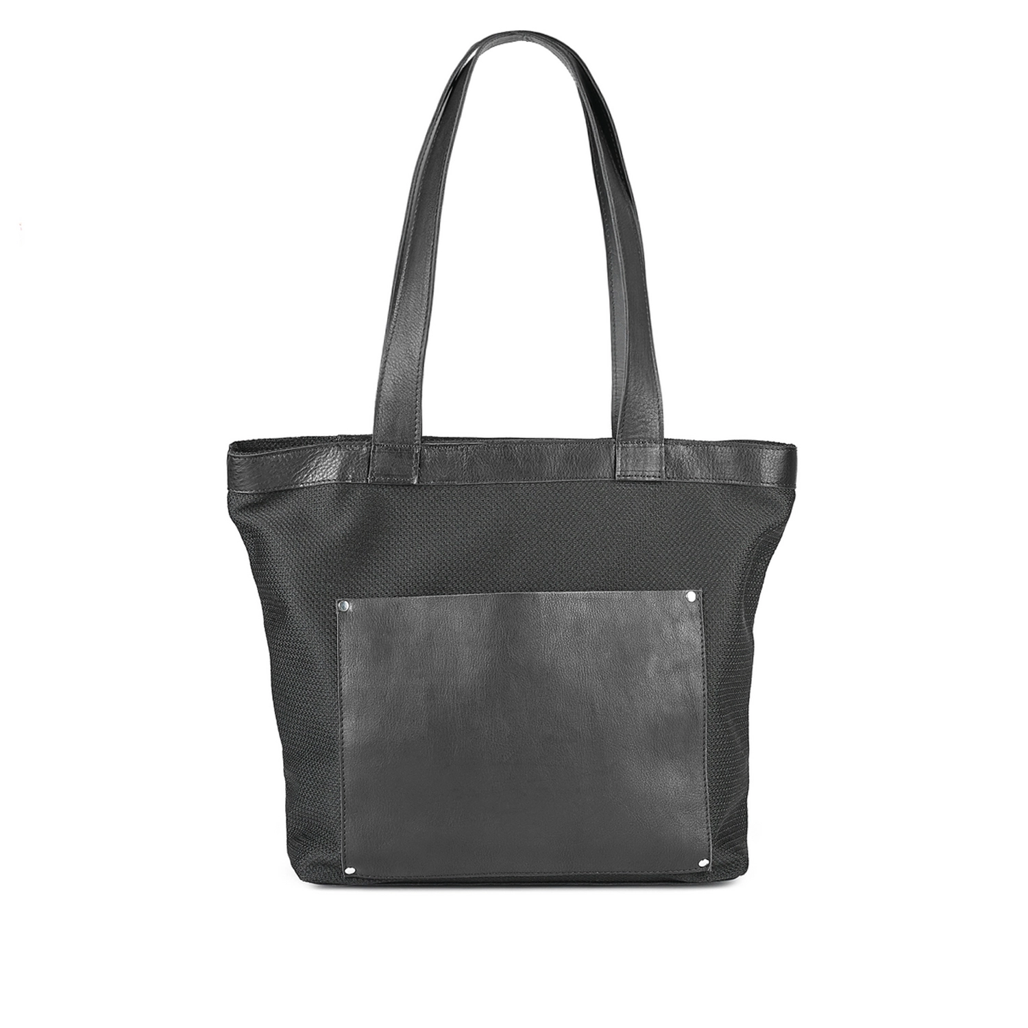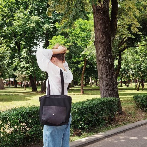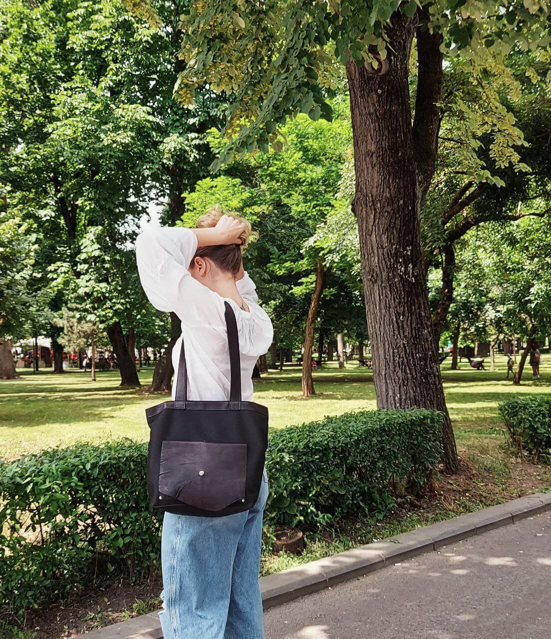 The Shopper este o geantă damă de umăr din piele naturală și pânză, cu un compartiment principal și două buzunare interioare pentru organizare.