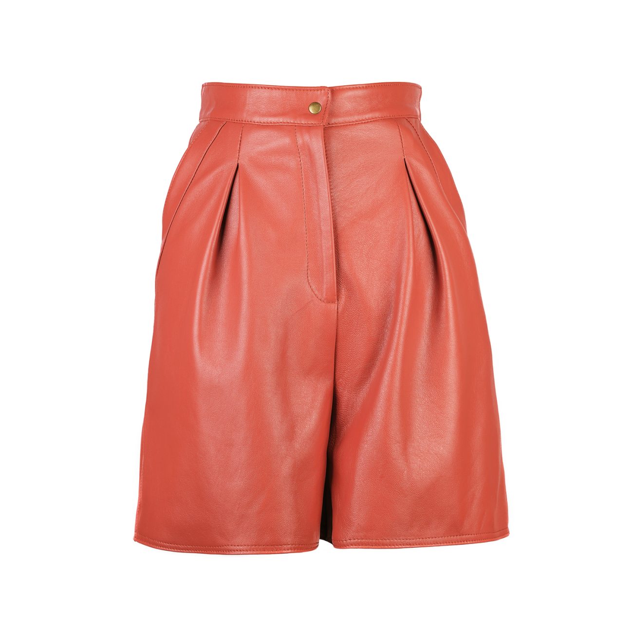 Pantaloni scurți din piele naturală coral, cu talie înaltă.